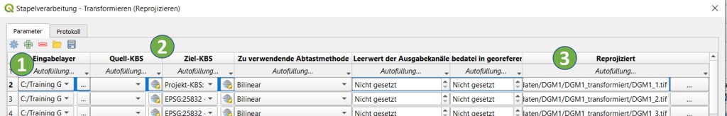 Den Eingabelayer füllen wir automatisch mit der Autoausfüllung und wählen in dem Ordner mit dem XYZ-Dateien alle nötigen Dateien aus. Quell-KBS lassen wir frei und die Ziel-KBS können wir z.B. auf den EPSG-Code 25832 stellen und anschließend mit der Autoausfüllung auf alle Dateien anwenden. Genauso gehen wir auch bei der Abtastmethode vor. Hier stellen wir auf Biliniear. In der letzten Spalte stellen wir den Speicherort ein. Dazu erzeuge ich gerne einen neuen Ordner mit dem Zusatz _transformiert und die Datei bennene ich DGM1_. Bei der Autovervollständigung kann man dann mit Zahl auffüllen wählen und so entstehen dann hinter dem Unterstrich die laufenden Nummern. Der Prozess kann nun je nach Datenmenge und Rechenleistung einige Zeit in Anspruch nehmen. Für einen ganzen Landkreis hat es bei mir 2 Stunden gedauert.