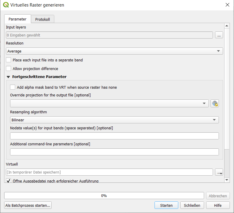 Bei der Abtastmethode stellen wir wieder bilienear ein. Die Ausgabedatei kann nun all temporäre Datei erzeugt werden, falls wir anschließend die Daten anderwertig z.B. als Geopackeage nutzen und abspeichern wollen. Falls wir nur die Übersicht haben wir wollen, dann können wir einen Dateinamen festlegen. Es entsteht eine VRT-Datei, die uns ermöglicht, eine einzelene Datei in das Projekt zu importieren, anstatt (wie hier im Beispiel) 58 Einzeldateien. Die Einzelnene Daten müssen aber immer an de gleichen Stelle bleiben und dürfen nachträglich nicht auf dem PC verschoben oder der Ordner umbenannt werden. Möchte man sich diese Unwegsamkeiten sparen, kann man dieses Raster in einer Geopackage speichern. Das wird im nächsten Kapitel erklärt.