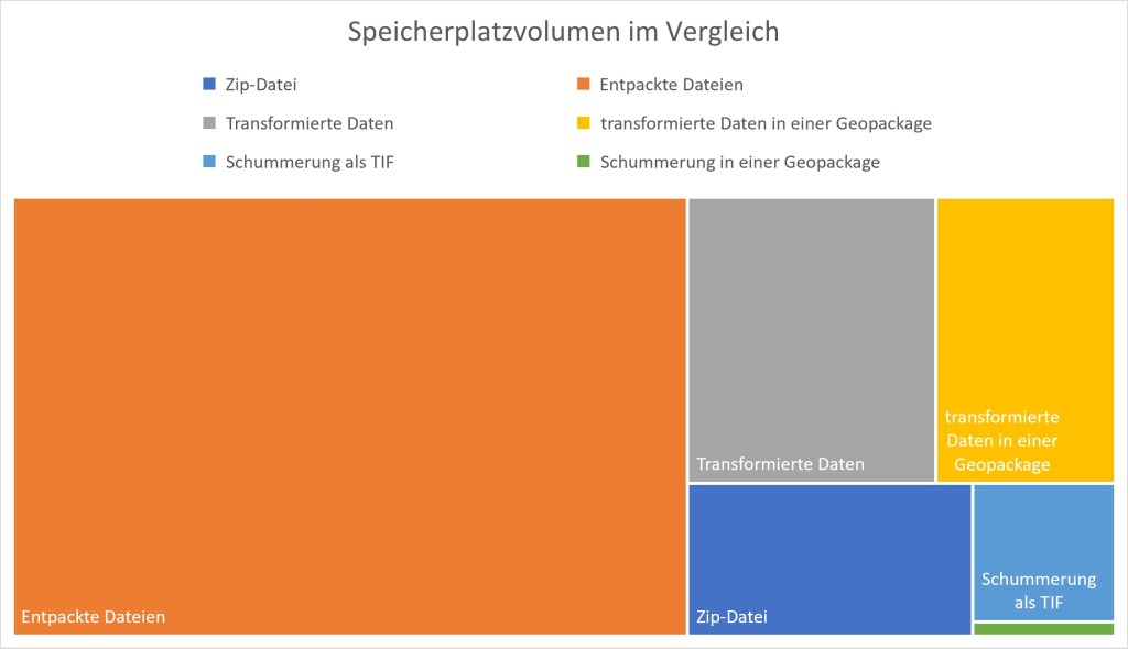 Nach der erfolgreichen Durchfühurung sollte der Speicherplatz nun nochmal um ca. 30% reduziert sein. Bei meinem Beispiel wurden so aus 360 MB knapp 260MB. Das geht auch noch besser. Denn eigentlich wollen wir in den meisten Fällen die Schummerung nutzen, um die Landschaft zu erkunden. Diese Schummerung benötigt viel weniger Platz. Über Raster –> Analyse –> Schummerung können wir wie oben schon beschrieben die Schummerung für das gesamte Raster anlegen. Diesen Layer können wir, wie soeben schon einmal praktiziert in einer Geopackage speichern. Anschließend verbraucht die erzeugte Schummerung in einer Geopackage nur noch 10 MB in meinem Beispiel.